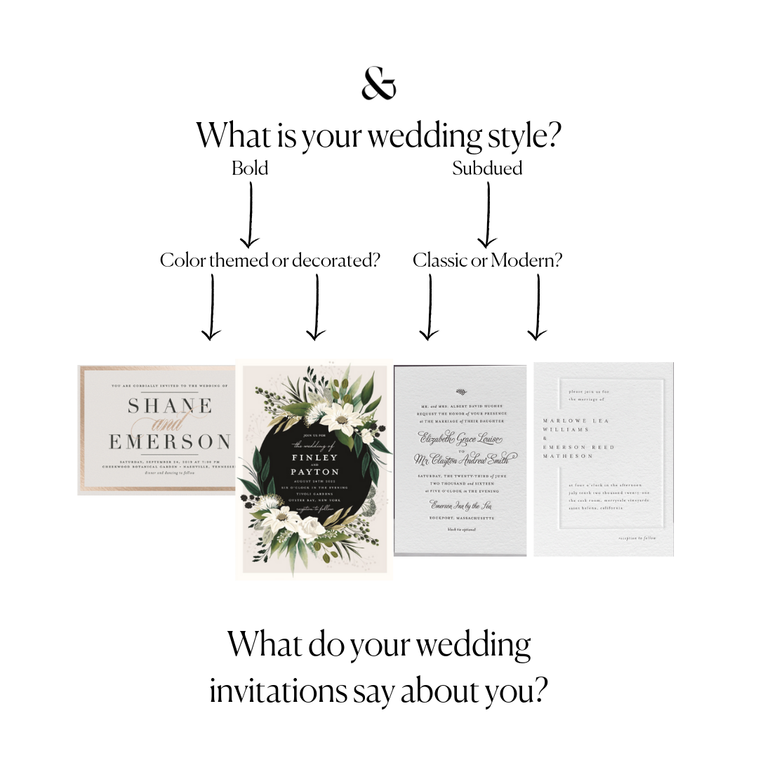 Will you be decorating with classic decorations, or are you opting for a modern wedding? If you want to stick with the classics, find an invitation design with organic shapes and elegant fonts. If you want to go with a modern look, choose an invite with cooler colors and geometric shapes. -